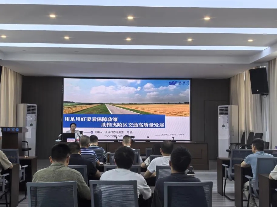 2024年8月9日,宜昌市夷陵区交通运输局组织举办“交通系统项目争取谋划专班第一次培训会议”,夷陵区交通运输局计划股罗清松主持会议。永业行鄂西区空间规划技术总监周鑫受邀就“用足用好要素保障政策 助推夷陵区交通高质量发展”作主题培训。